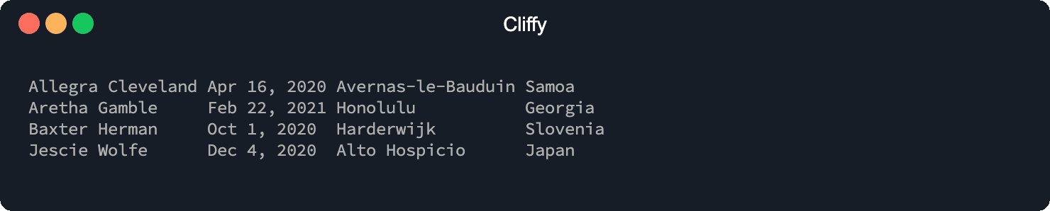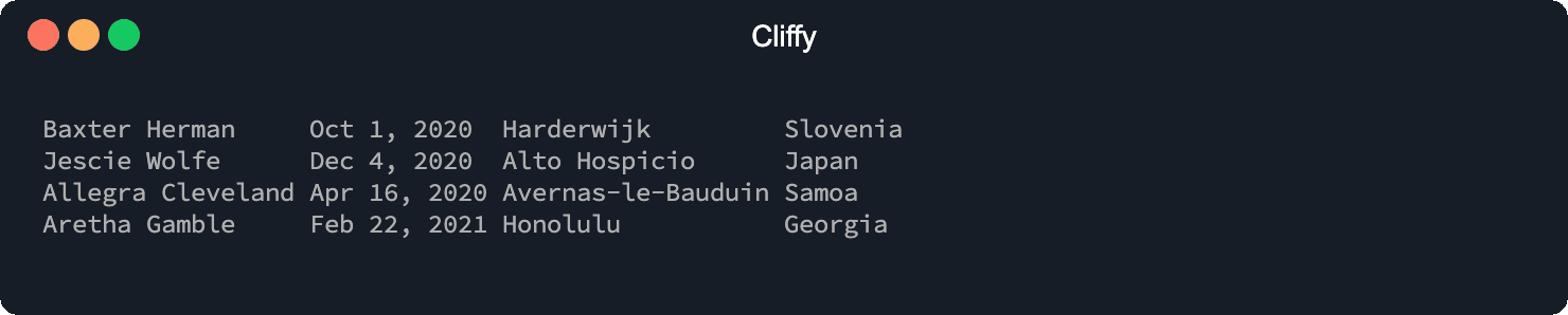 $ deno run http://cliffy.io/examples/v1.0.0/table/basic_usage.ts